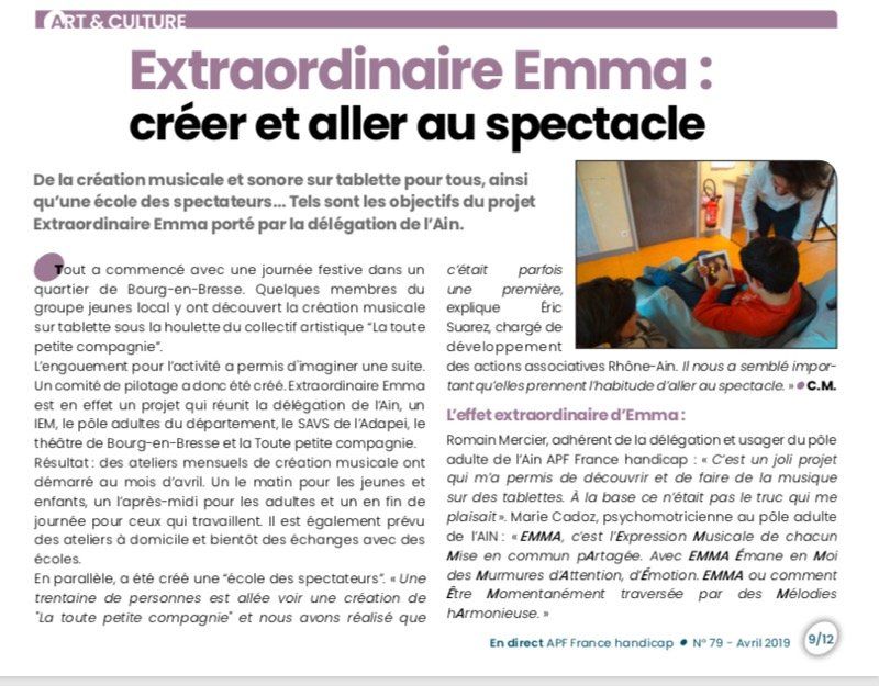 E.M.M.A., « Ensemble Multidiffusion pour les Musiques des Applications », est une activité menée par des musiciens professionnels qui permet à des groupes de fabriquer de la matière sonore à partir d’objets numériques équipés d’applications musicales.
